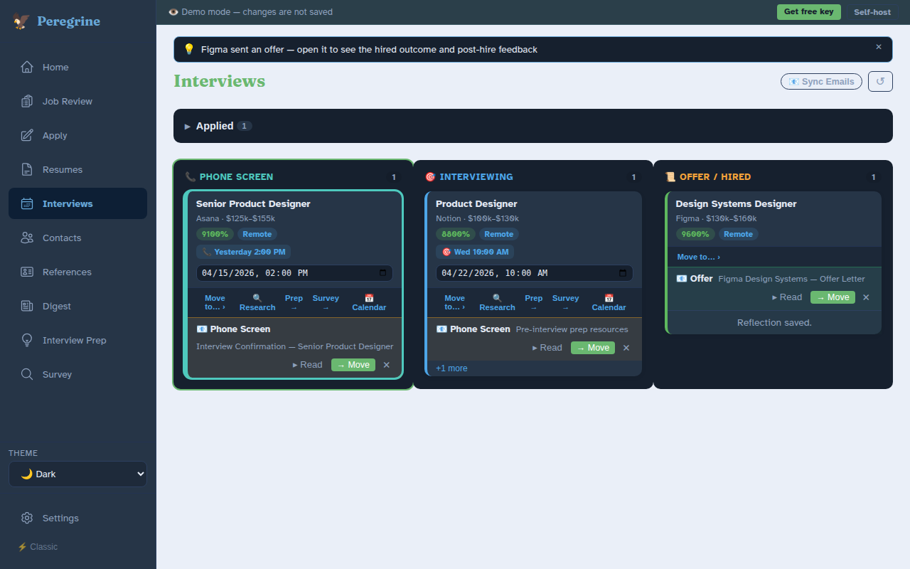 Six new screenshots (dashboard, card-stack review with approve/reject tint, apply workspace, interviews kanban) plus an animated GIF of the swipe-review flow. Adds demo link above the fold.