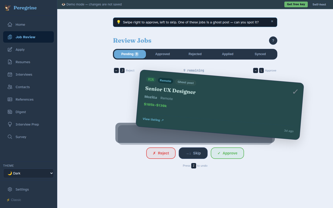 Six new screenshots (dashboard, card-stack review with approve/reject tint, apply workspace, interviews kanban) plus an animated GIF of the swipe-review flow. Adds demo link above the fold.
